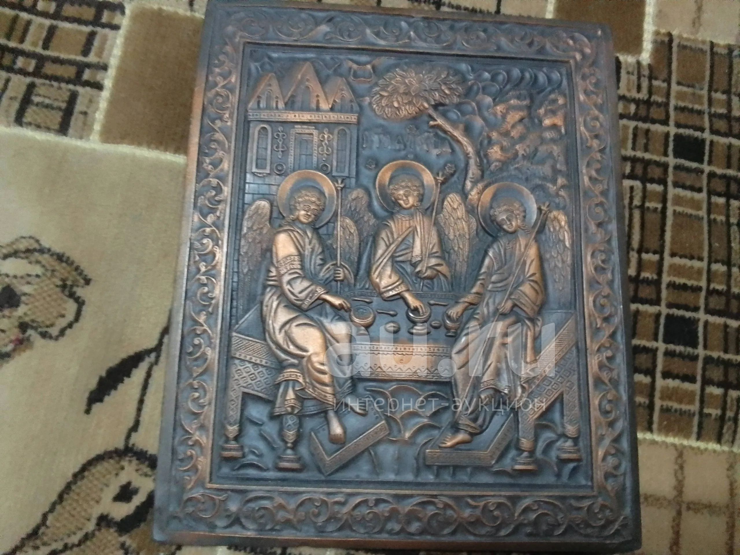 Размер 16,5 см*20 см На иконе изображены три ангела, сидящие за престолом, на котором стоит чаша с головой тельца, приносимого в жертву. На фоне представлены дом (палаты Авраама), дерево (дуб Мамврийский) и гора (гора Мориа). Фигуры ангелов расположены так, что линии их фигур образуют как бы замкнутый круг. Они сидят, слегка склонив головы, и смотрят вдаль. Композиционным и смысловым центром здесь выступает чаша. Она трактуется как символ евхаристии, а ветхозаветный телец — предтеча агнца из Нового завета. Руки среднего и левого ангелов направлены к чаше с благословляющим жестом. В иконе нет активного действия и движения — фигуры словно застыли в неподвижном созерцании, а их взгляды устремлены в вечность.