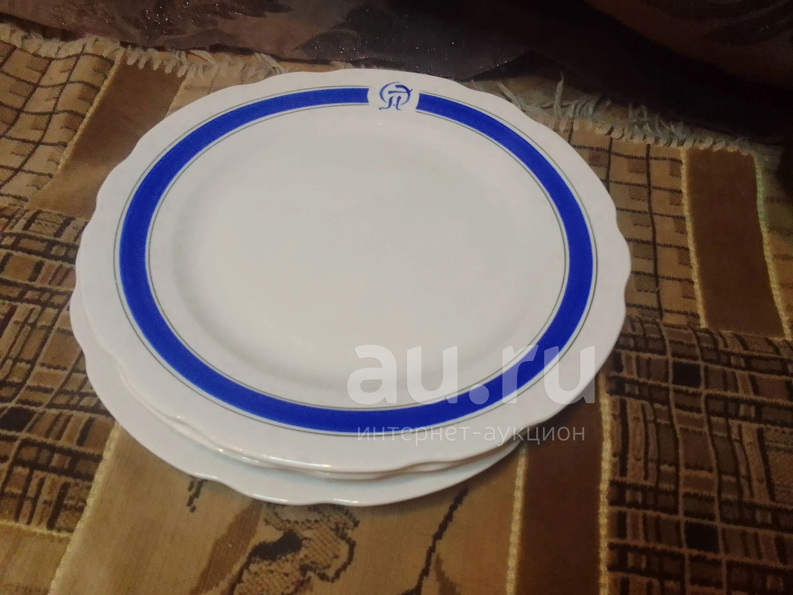 Тарелки плоские с голубой каемочкой и буквами ОП диаметр 24 см Коростень СССР 1957-1960-е гг.