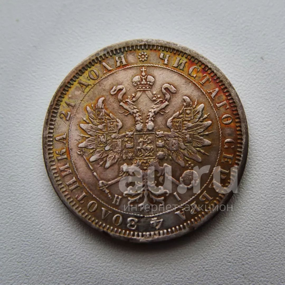 Аверс: по кругу вдоль края монеты разделенная вверху розеткой надпись «ЧИСТОГО СЕРЕБРА 4 ЗОЛОТНИКА 21 ДОЛЯ», в середине в круге из точек Малый Государственный Герб Российской империи, внизу слева и справа от хвоста орла инициалы минцмейстера «НІ» (Николай Иосса).