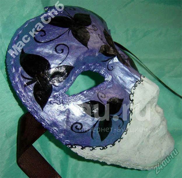 Маска ручной работы из папье-маше, роспись - краски, стразы, покрыта лаком, сзади - ленты для крепления, края маски оклеены тесьмой.