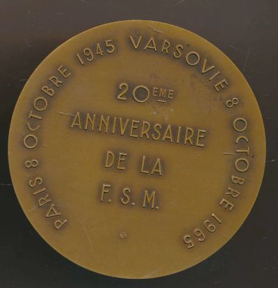 Франция 1965 Медаль Всемирная федерация профсоюзов WFTU 20 лет D - 59 mm Бронза 142гр