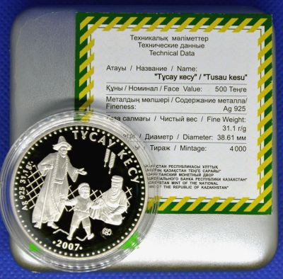 Казахстан 500 тенге 2007 г. Тусау кесу, серия Обряды и национальные игры Казахстана, Серебро Ag 925