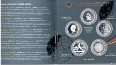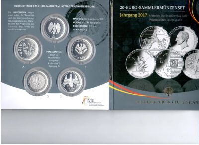 Германия 20 евро 2017 набор 5 монет Proof Ag Серебро официальный альбом блистер буклет
