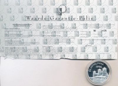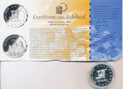 Финляндия 20 евро 1996 Олавинлинна Proof cеребро Ag сертификат капсула