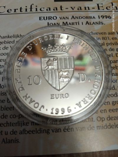 Андорра 1996 10 динаров епископ Уржеля князь 25 лет правления Proof Сертификат Ag Серебро капсула